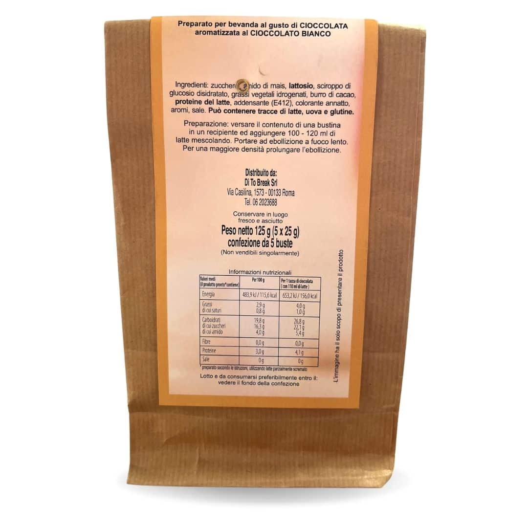Ingredienti: Zucchero, Amido di mais, Lattosio, Sciroppo di glucosio disidradato, Grassi vegetali idrogenati, Burro di cacao, Proteine del latte, Addensante (E412), Colorante annatto, Aromi, Sale. Può contenere tracce di latte, uova e glutine.